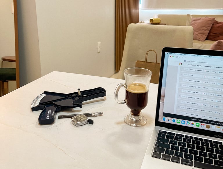 Durante a consulta, faço a sua composição corporal com adipômetro (presencial) OU Body3D, uma avaliação por fotos e medidas (online).